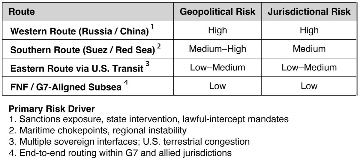 The FNF Solution: A geopolitically decoupled "Fourth Route." By traversing only the sovereign waters of Allied nations, FNF provides absolute path diversity that is immune to regional chokepoint disruptions.